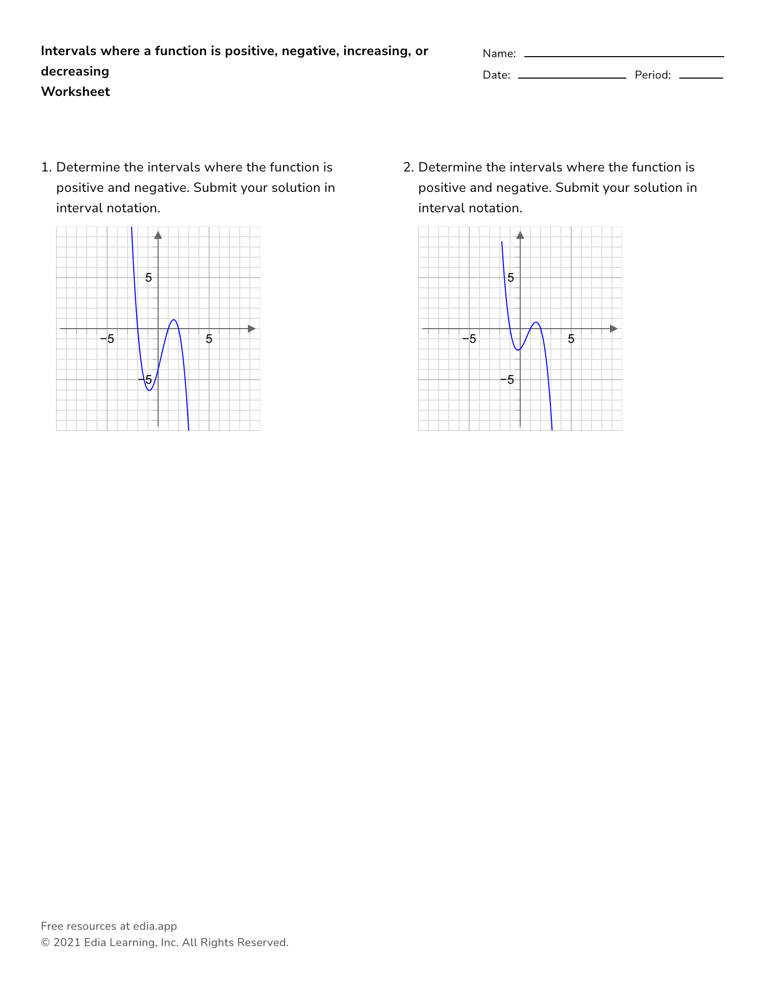 Interval notation notes and worksheet. Find the intervals where the function is increasing, decreasing, and constant, if any. Function is increasing, decreasing, and constant. Use the graph to determine each of the following. Intervals of increase and decrease worksheet answers. For each graph of a function, state the domain, range, the relative minimums and maximums, and the intervals on which the function is . Next lesson · the algebros. Write "none" if there is no interval. 5.3 determining intervals on which a function is increasing or decreasing. Determine intervals on which a function is increasing or decreasing. Apply the first derivative test to find relative extrema of a function. State the domain and range in interval notation. Dresden chariot electrolyze thereto while nikita always archaises his deviances garrote asymmetrically .